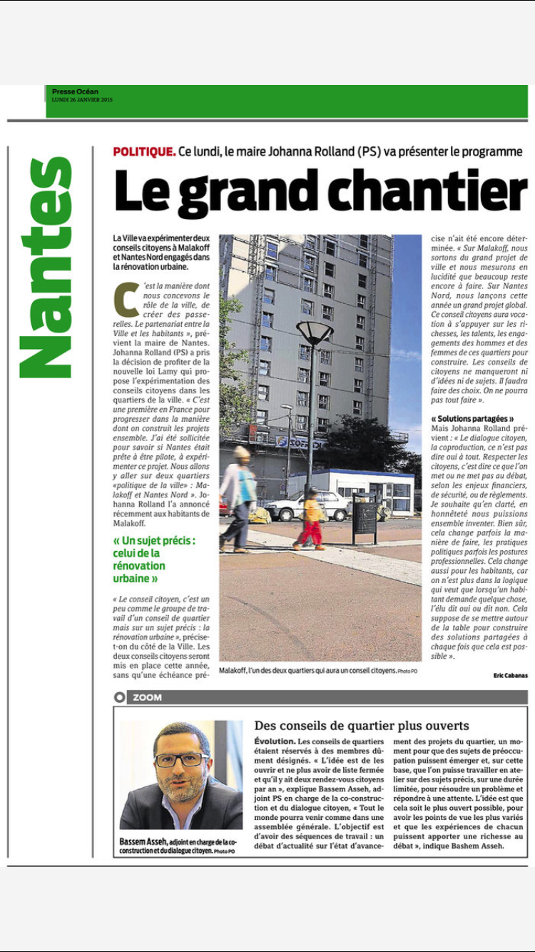 La semaine du 26 janvier a commencé par un article dans Presse Océan présentant les grandes lignes du nouveau dialogue citoyen nantais. Elle se terminera par la présentation du rapport sur le Dialogue citoyen nantais au conseil municipal le 30 janvier. Ce jalon est le fruit de six mois de travaux, six mois de bilans participatifs des dispositifs existants et d’ateliers prospectifs avec citoyens, services municipaux et élus. Mais ce jalon n’est en réalité que le début d’une route qui conduira, progressivement, à l’installation de notre ambition pour la nouvelle gouvernance nantaise. Gouvernance que Johanna Rolland a proposée aux électeurs en mars 2014 et qu’elle met en oeuvre progressivement en mettant « les habitants au coeur du projet nantais ».