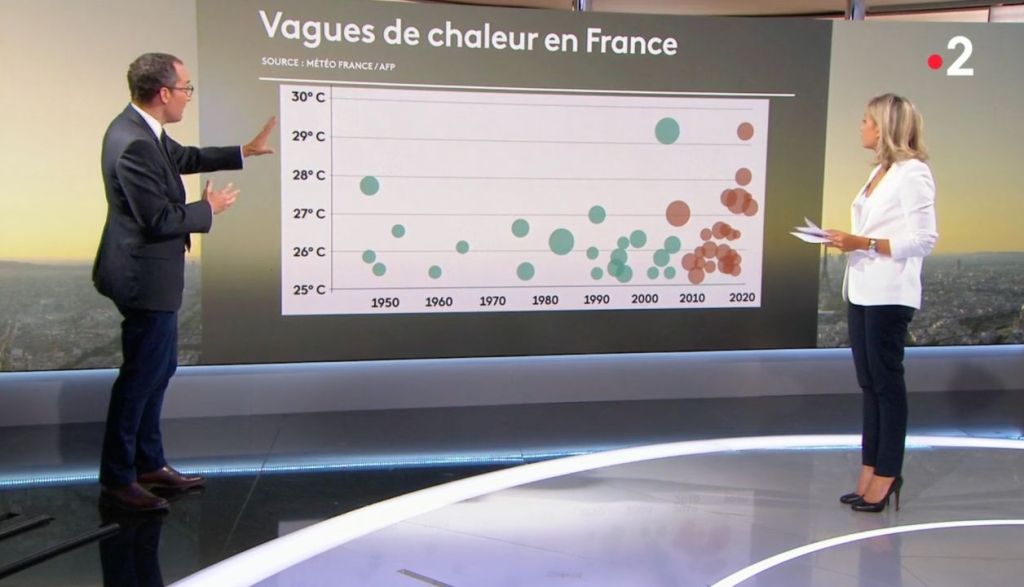 Je n’aime pas juger un phénomène long (exemple : le réchauffement climatique) sur la base d’un petit échantillon (exemple : la météo du jour). Je suis donc ravi que le service public audiovisuel ait diffusé dans le JT d’hier soir (France 2) les deux graphiques ci-dessous qui montrent justement le temps long.